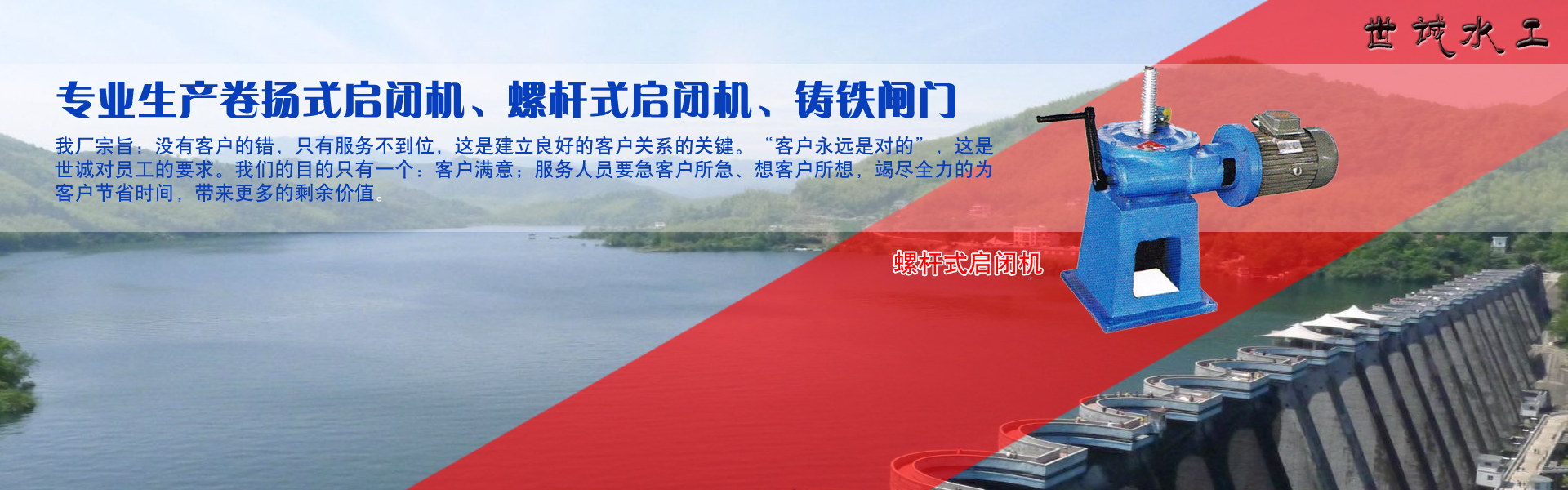 世誠(chéng)始終堅(jiān)持“以客戶(hù)為導(dǎo)向、以質(zhì)量為重心、以服務(wù)為核心”,確??蛻?hù)用到更合適的產(chǎn)品。渠道、河道、水庫(kù)雨水泵站用螺桿式啟閉機(jī)、卷?yè)P(yáng)式啟閉機(jī)、鑄鐵閘門(mén)、鋼閘門(mén)、格柵清污機(jī)、攔污柵、智能測(cè)控一體化閘門(mén)、閘門(mén)止水橡皮、施工縫用橡膠止水帶等,二十年來(lái)我們始終如一,誠(chéng)信服務(wù)每一位客戶(hù)。打造中國(guó)水利機(jī)械,工程橡膠放心品牌!